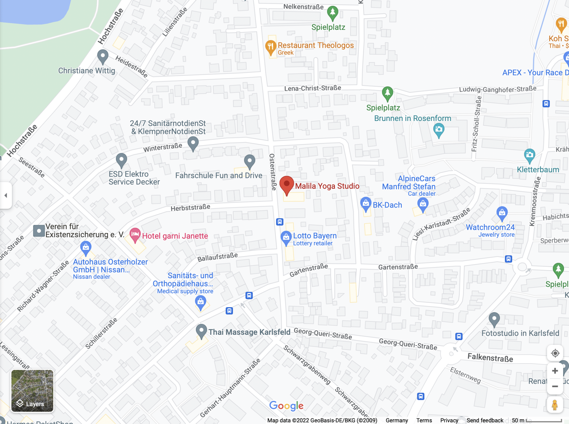Ich möchte dich gerne Willkommen heißen in meinem kleinen grünen Yoga Studio in Karlsfeld. Da ich mich am wohlsten im Grünen fühle, wollte ich, dass dies auch in meinem Studio zu spüren ist. Inspiriert durch die Ruhe und die Einheit der Natur möchte ich, dass auch du dich hier wohlfühlst und zu Ruhe findest. Mit Malila wollte ich einen Ort schaffen, um sich selbst ganz natürlich zu entdecken und zu sich zu finden.